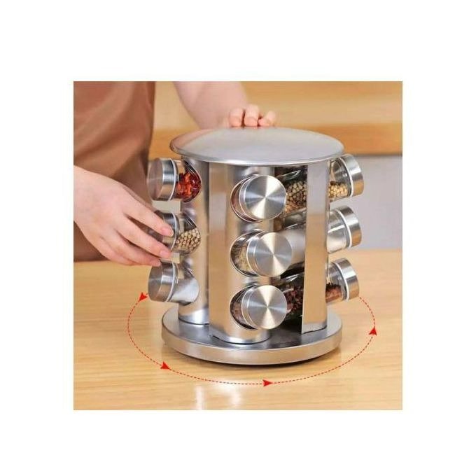 - Spice carousel with 12 containers on 3-level spice racks.