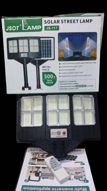 Brighten your outdoor areas with the JSOT LAMP JS-117 Solar Street Light, equipped with a powerful 500W ultra-bright LED. This eco-friendly light runs on solar energy and boasts smart features like motion detection and light sensing for automatic operation at night. It’s powered by a high-capacity lithium battery, providing long-lasting performance. Built to last, the lamp is rainproof and features a high-efficiency solar panel for optimal energy absorption. With a simple, wire-free installation, it’s a convenient solution for diverse outdoor lighting applications.