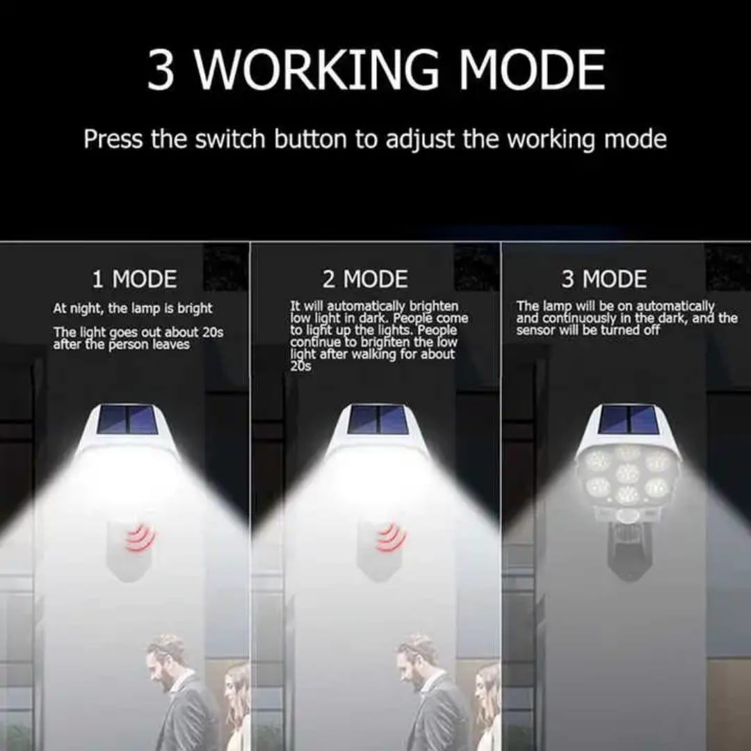 Solar-powered 180 watts, motion sensor light, camera-like appearance for security; perfect for outdoor areas like porches, gardens, patios, and driveways.